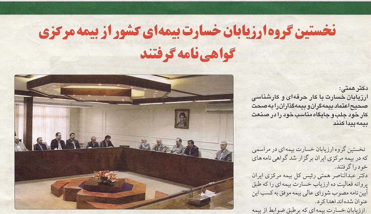 در سال ۱۳۸۵ در نخستین دعوت از ۱۰ نفر ارزیاب خسارت بیمه ای آقایان محمد حسین غریب در رشته حادثه ، عباس گلچینیان وهوشنگ یوسفی در رشته آتش سوزی ، سیامک ملک مطیعی ،داود کاشی پزها و فرداد عمیدی در رشته درمان، کاظم طلائی ویوسف سپاس مقدم در رشته باربری ، مجید ذوالفقار خانی در رشته اتومبیل و بالاخره شروین اسدی غفاری در رشته حادثه و درمان که مدارک آنها تکمیل شده بود طی مراسمی با حضور رئیس کل واعضای هیئت مدیره بیمه مرکزی ایران گواهی نامه های آنان اعطا شد.
