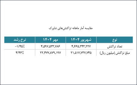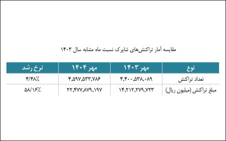 بر اساس این گزارش، تعداد تراکنشهای مهرماه ۱۴۰۴ نسبت به ماه مشابه سال ۱۴۰۳ با رشد ۴.۴۸ درصدی همراه بوده و از نظر ارزش ریالی نیز افزایشی معادل ۵۸.۱۶ درصد را تجربه کرده است.