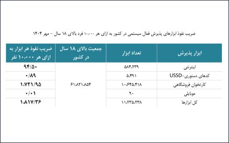 در مهرماه ۱۴۰۴، ضریب نفوذ کل ابزارهای پذیرش فعال در شبکه حدود ۱.۸۱۷.۳۶ ابزار به ازای هر ۱۰ هزار نفر بالای ۱۸ سال در کشور بوده است. بیشترین سهم این ابزارها متعلق به کارتخوانهای فروشگاهی است که حدود ۱.۷۲۱.۹۵ عدد به ازای هر ۱۰ هزار نفر در دسترس است. در مقابل، ابزار پذیرش موبایلی کمترین نفوذ را داشته و تنها ۰.۰۱ ابزار به ازای هر ۱۰ هزار نفر فعال است. ابزار پذیرش کدهای دستوری (USSD) با ۰.۸۹ ابزار و ابزارهای پذیرش اینترنتی با ۹۴.۵۰ عدد به ازای هر ۱۰ هزار نفر در میانه این ردهبندی قرار دارند.