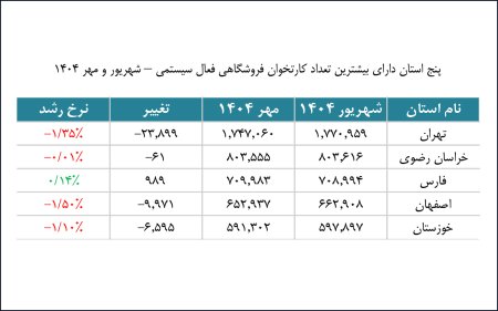 طبق گزارش شاپرک، استانهای تهران، خراسان رضوی، فارس، اصفهان و خوزستان به ترتیب بیشترین تعداد کارتخوان فروشگاهی فعال را در مهرماه ۱۴۰۴ داشتهاند.