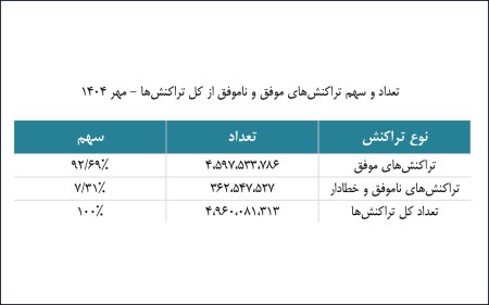 بررسی اطلاعات مربوط به تعداد تراکنشهای موفق و ناموفق (خطادار) کل شبکه شاپرک در مهرماه ۱۴۰۴ نشان میدهد که ۹۲.۶۹ درصد از تراکنشها موفق و ۷.۳۱ درصد از آنها ناموفق بودهاند.